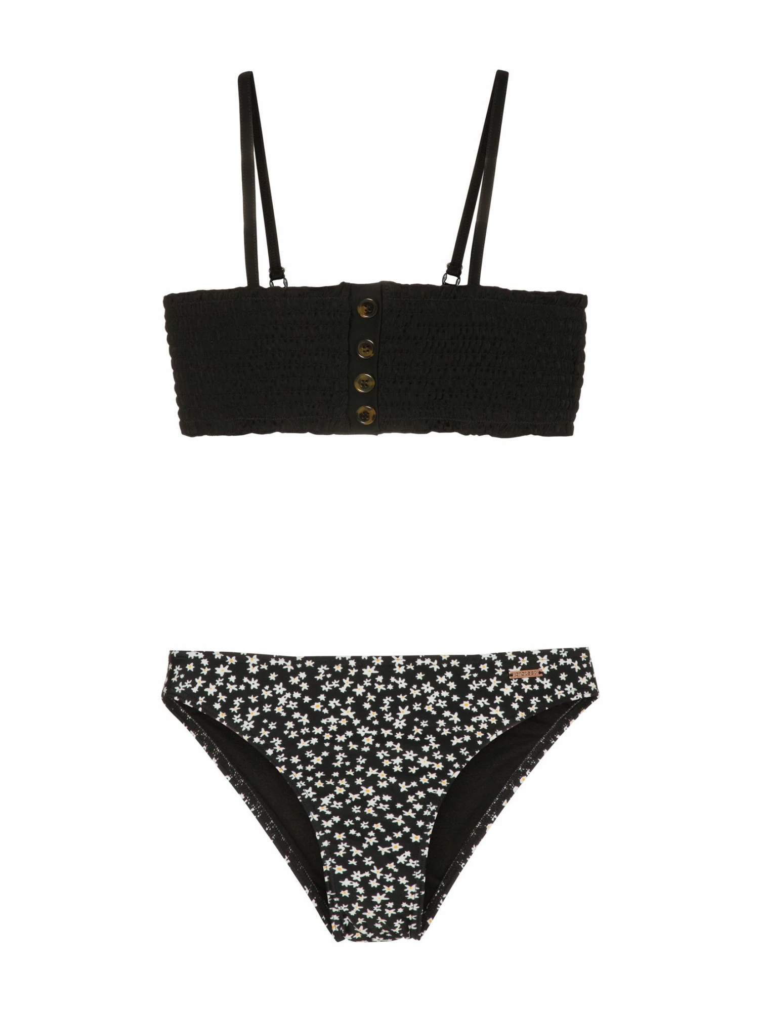Hier ist der aufregende Keet JR von Protest. Dieser Bikini besticht durch ein gesmoktes Bandeau-Bikini-Oberteil. Die Träger sind verstellbar. Die Knopfleiste am Bikini-Oberteil ist lediglich Dekoration – die Knöpfe lassen sich nicht öffnen! Dieser Bikini ist speziell für Teenager in den Größen 140-176 erhältlich. Die Bikini-Hose hat eine normale Passform und ist mit einem wunderschönen Minimuster bedruckt. Der Stoff ist außerdem PFC-frei, um die Verwendung dieser Chemikalien und ihre schädliche Wirkung auf die Umwelt zu reduzieren. Im Keet JR von Protest bist du für den Sommer bereit. Das Model ist 1,52 m groß und trägt Größe 152.